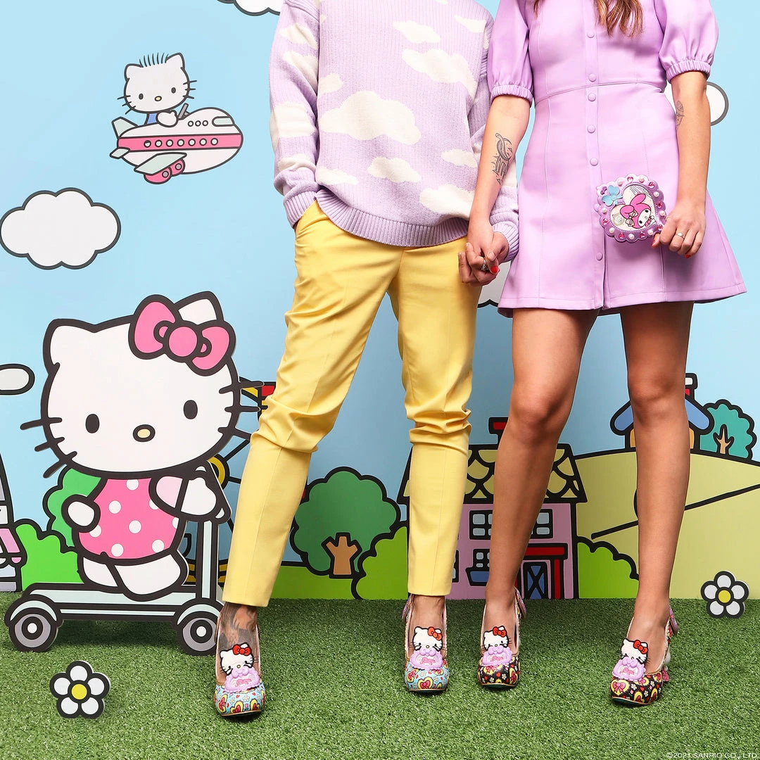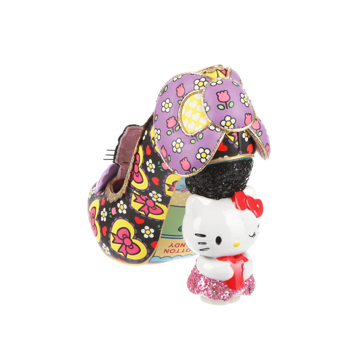 Show the world your kawaii side with these eye-catching heels! A Hello Kitty shaped character heel is encrusted in glitter and painted to perfection! The body of the shoe is an adorable bow, heart and flower print on a black background, this is topped with a striking purple heart frame on the toe and a statement purple printed bow on the back! For just that extra touch there is an adorable Hello Kitty peeking over the heart on the front! Bursting with detail and character, add these beauties to your wardrobe today!