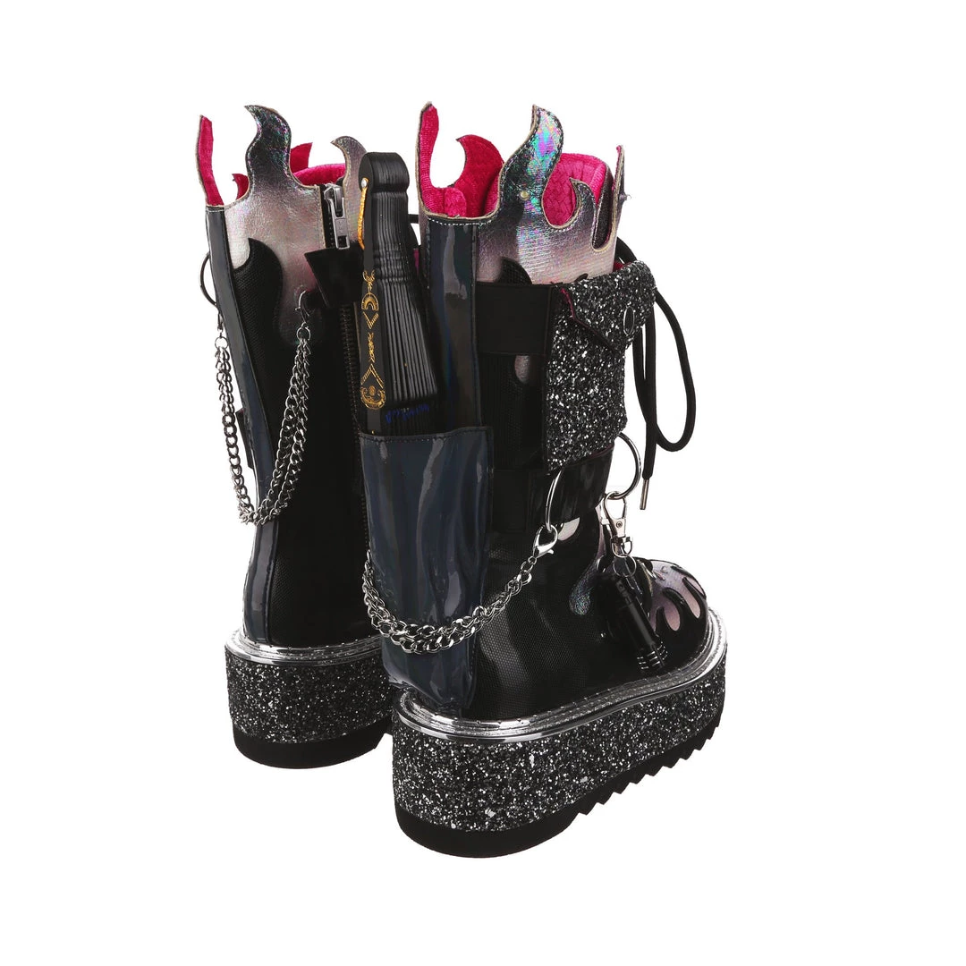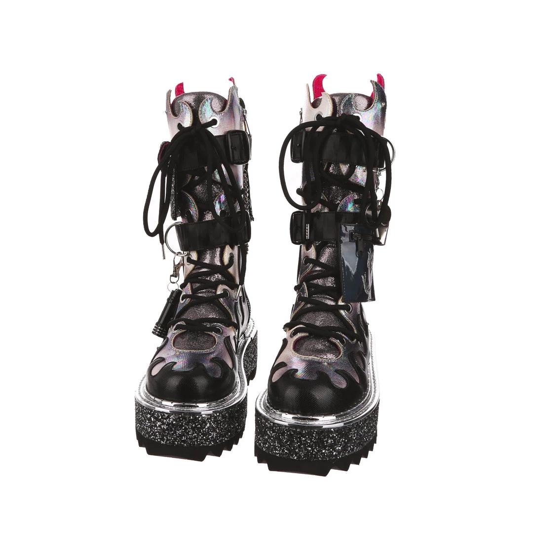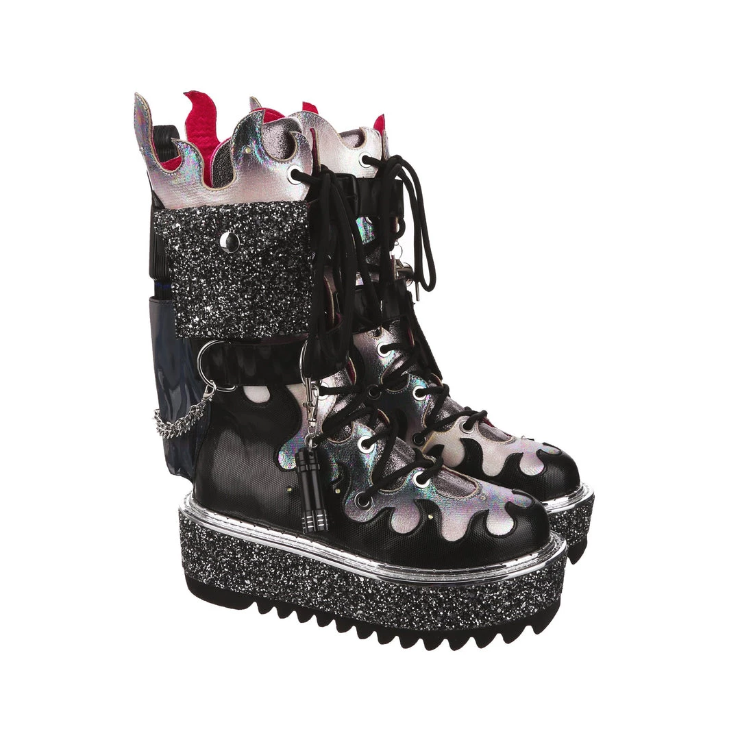 The ultimate lesson in IC maximalism, in collaboration with Tibbs and Bones, come these serious statement boots! These Super Hot platform boots have a super cool metallic iridescent, silver, and black upper in retro flames, sprinkled with light-up LED’s. Be ready for any festival eventuality with awesome accessories like a fan on the back of one of the boots, and a whistle, torch, and two mini purses!