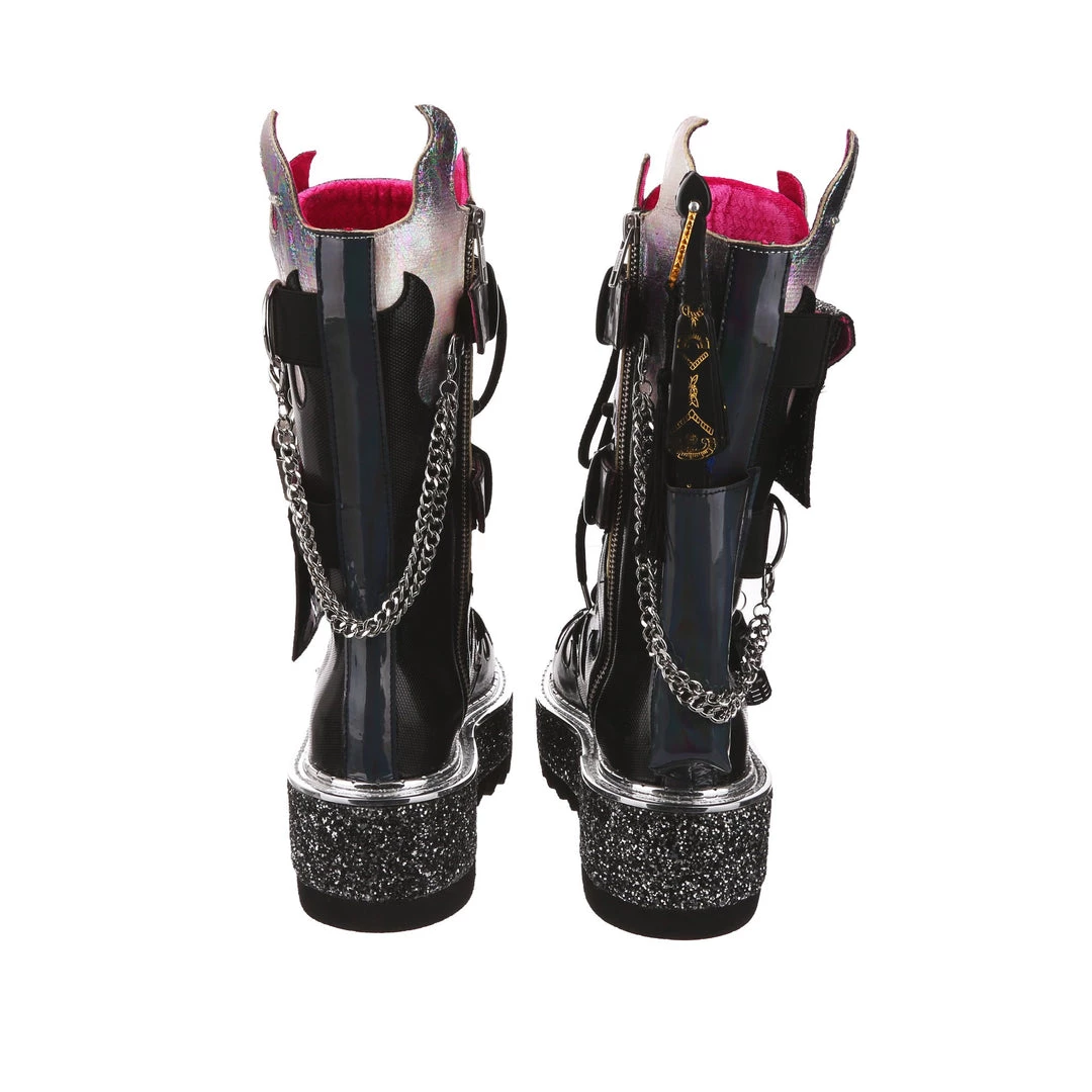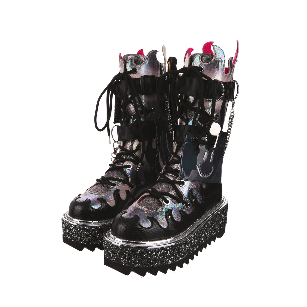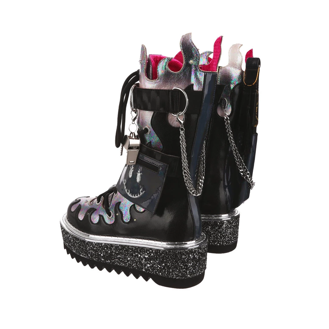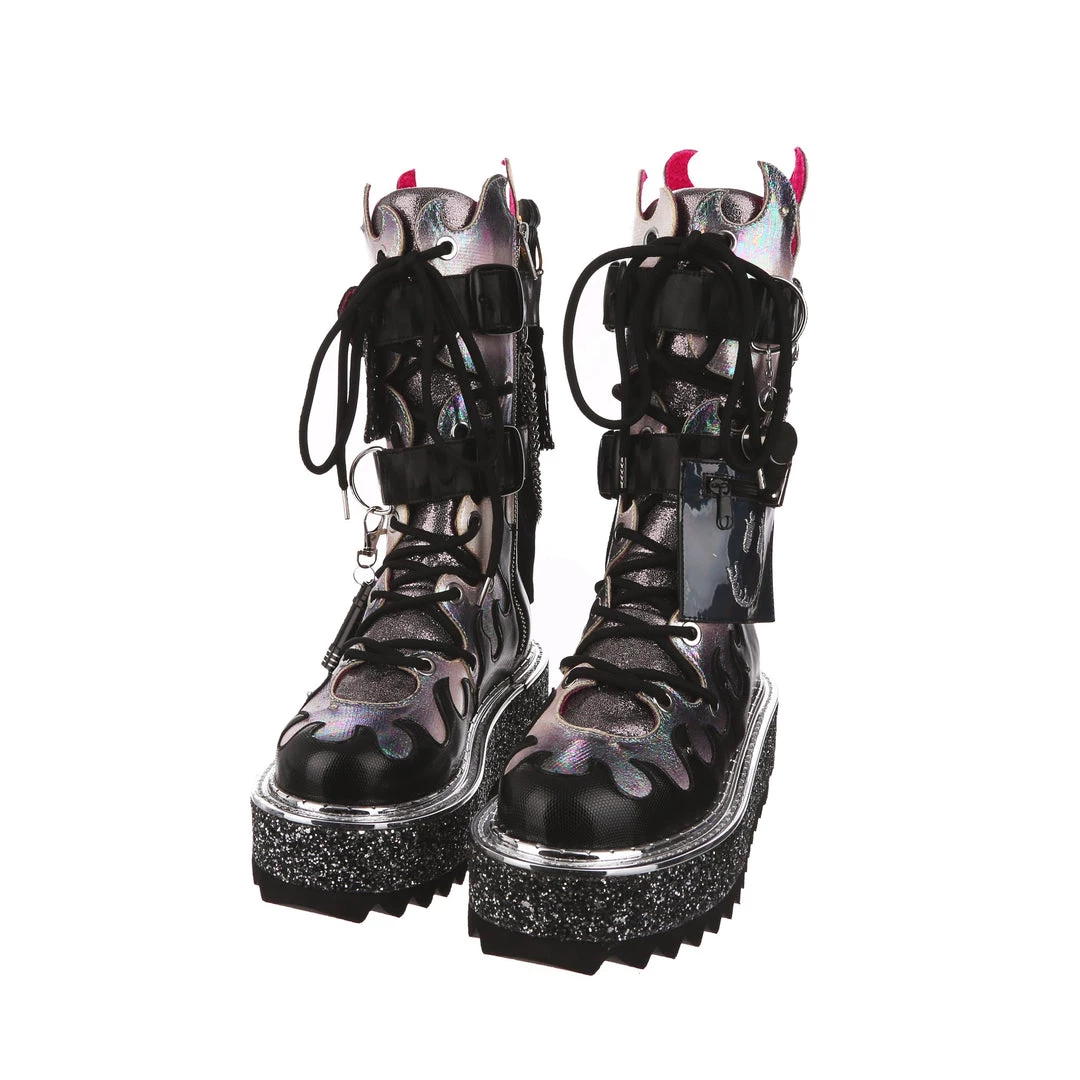 The ultimate lesson in IC maximalism, in collaboration with Tibbs and Bones, come these serious statement boots! These Super Hot platform boots have a super cool metallic iridescent, silver, and black upper in retro flames, sprinkled with light-up LED’s. Be ready for any festival eventuality with awesome accessories like a fan on the back of one of the boots, and a whistle, torch, and two mini purses!