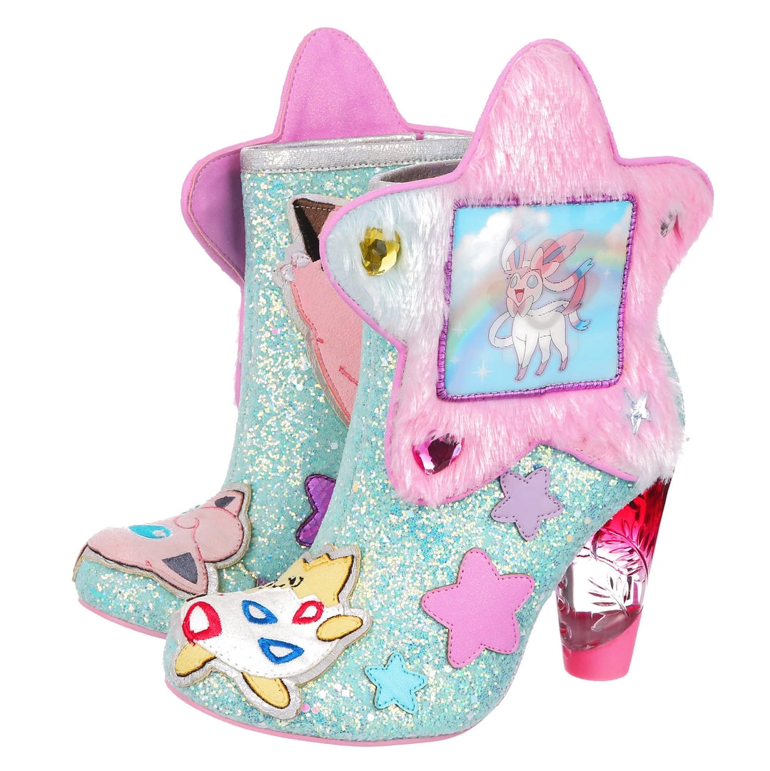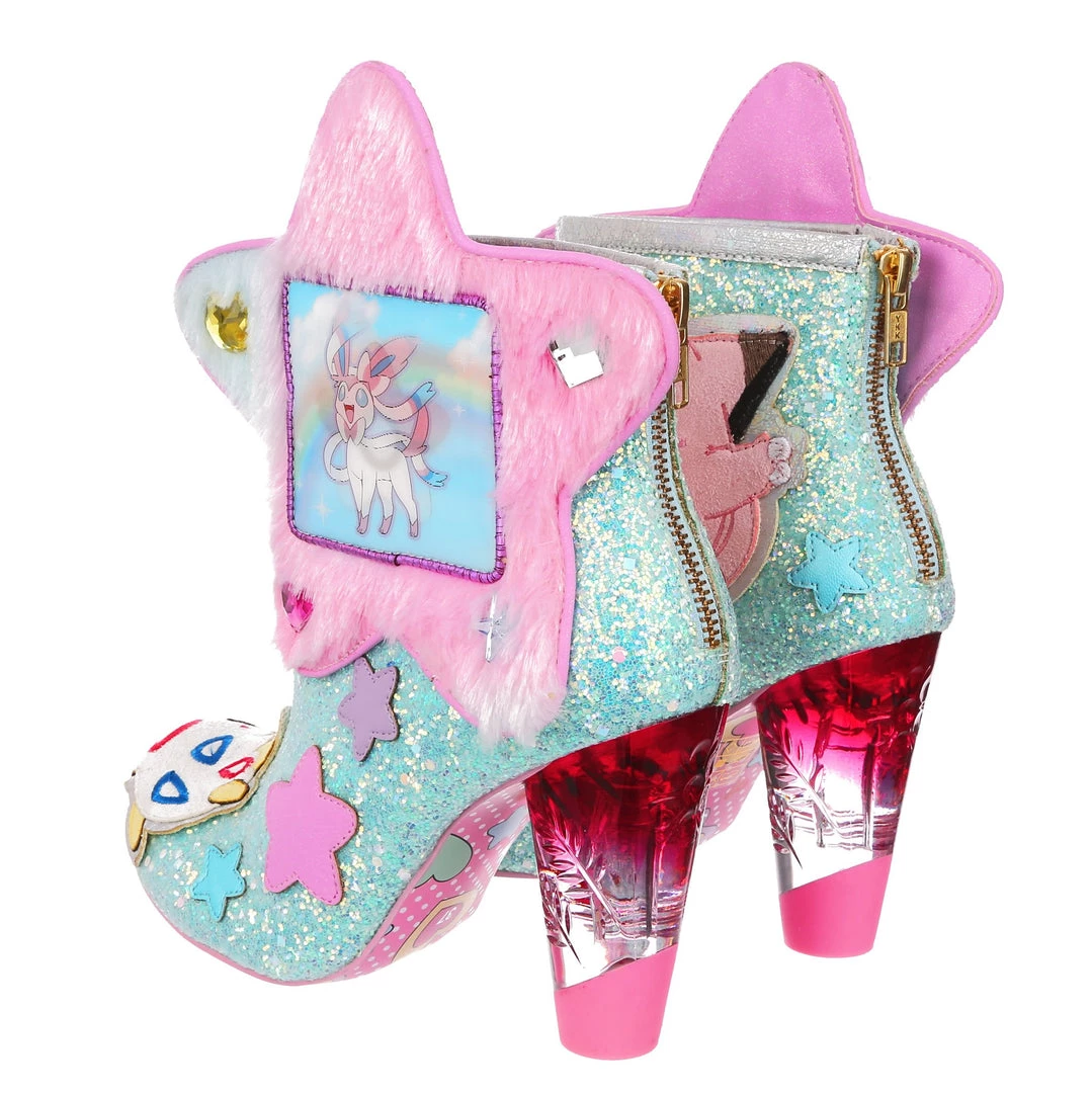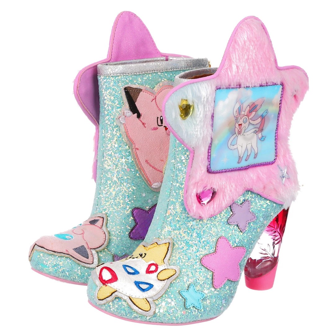 Fairy fabulous, these heels are sure to make you feel like you are on cloud nine! Featuring some of your favourite fairy-type Pokémon dotted all around the sparkling mint glitter upper, and even a lenticular image in the fuzzy pastel star on the side of the booties! All brought together by our gorgeous statement ombre lucite heel so you really feel like you are floating on air! Featuring Jigglypuff, Togepi, Slurpuff, Clefairy, Sylveon, & Alcremie.
